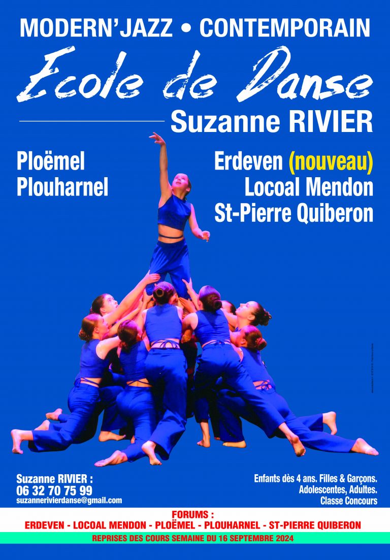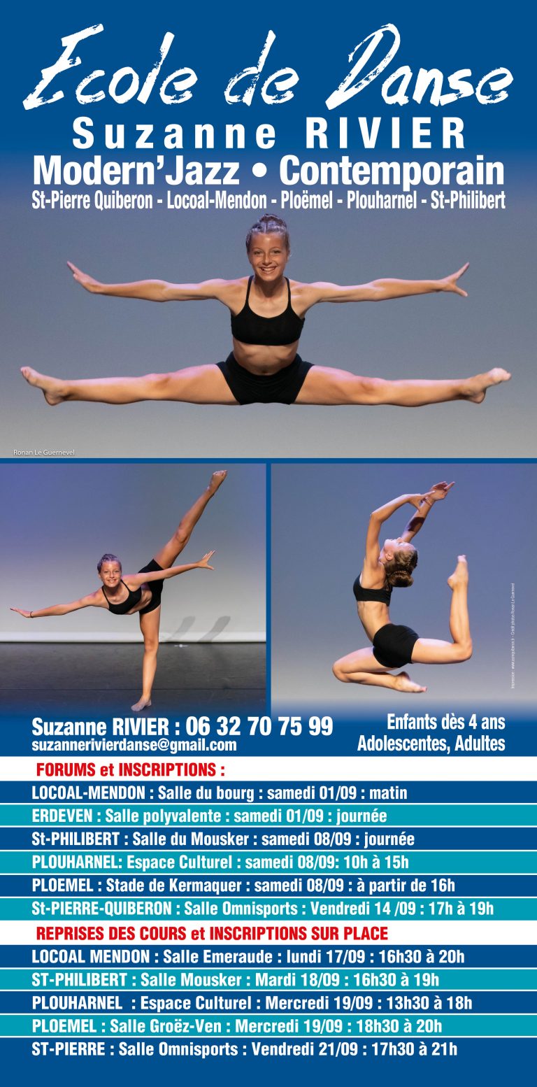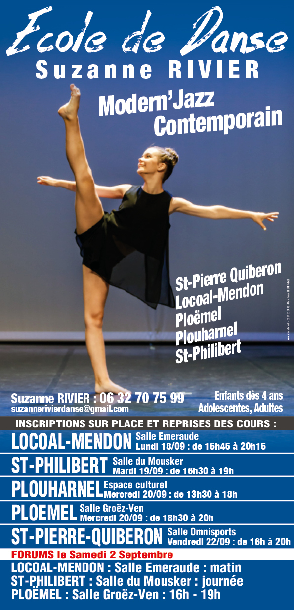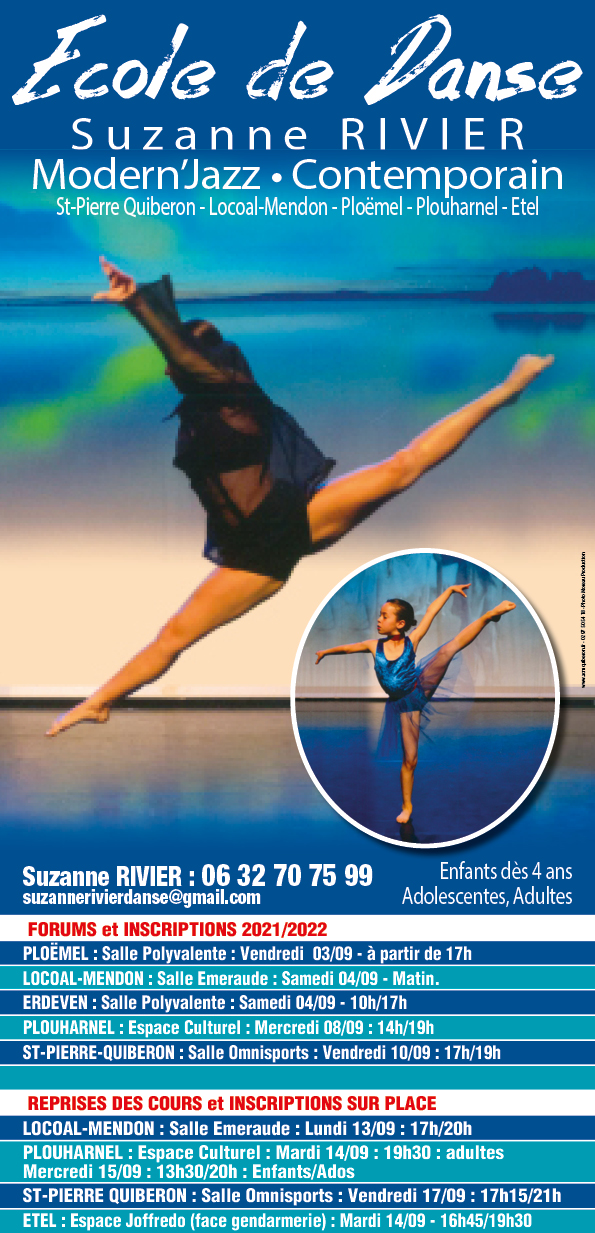 L’école de danse a été créée par Suzanne RIVIER, à Saint-Pierre-Quiberon, puis s’est agrandie et l’ouverture de celle de Plouharnel a complété la Danse sur la Presqu’île de Quiberon. Ensuite, les écoles de Ploëmel, Locoal Mendon , Saint-Philibert, Etel , Erdeven ont vu le jour.