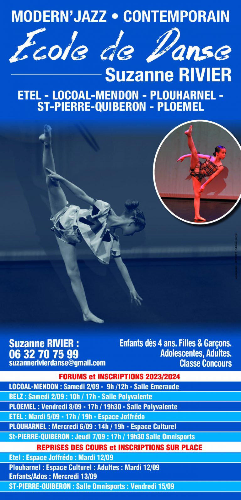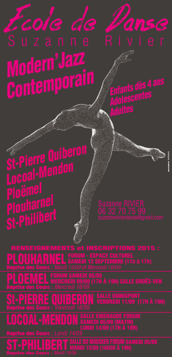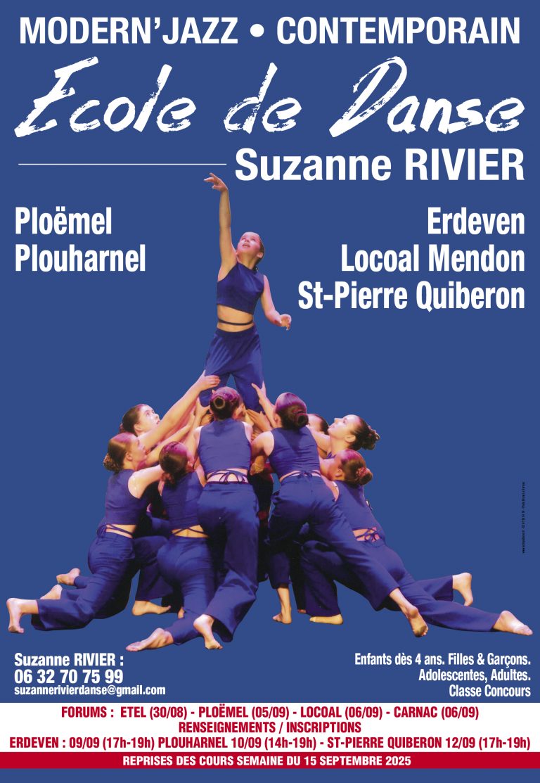 L’école de danse a été créée par Suzanne RIVIER, à Saint-Pierre-Quiberon, puis s’est agrandie et l’ouverture de celle de Plouharnel a complété la Danse sur la Presqu’île de Quiberon. Ensuite, les écoles de Ploëmel, Locoal Mendon , Saint-Philibert, Etel , Erdeven ont vu le jour.